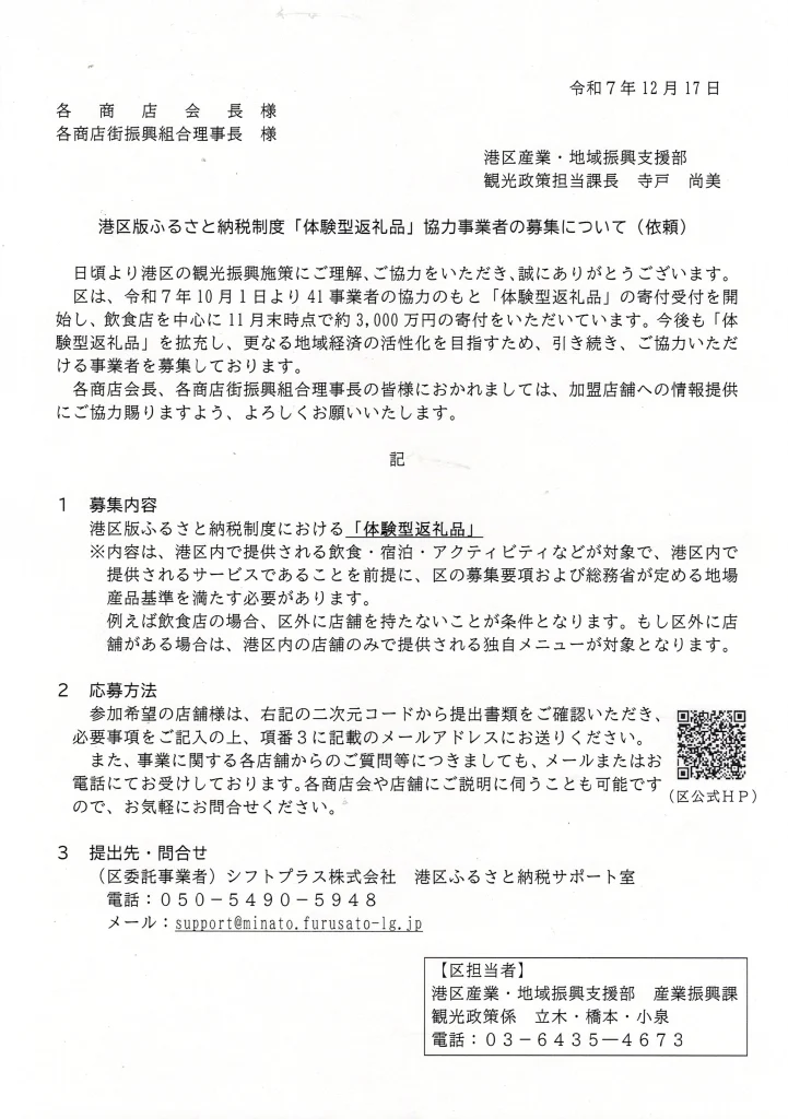 港区版ふるさと納税制度「体験型返礼品」協力事業者の募集について(依頼)